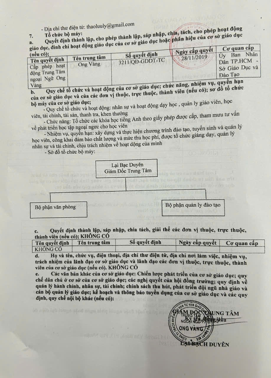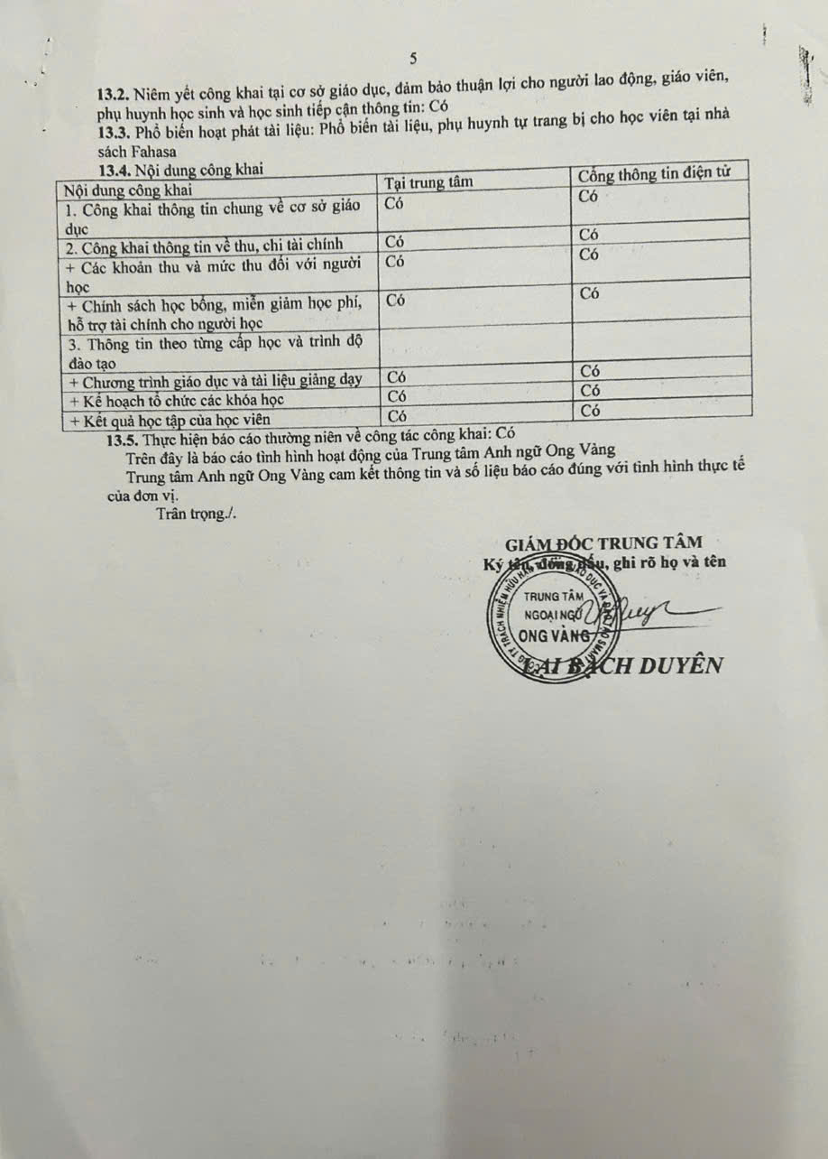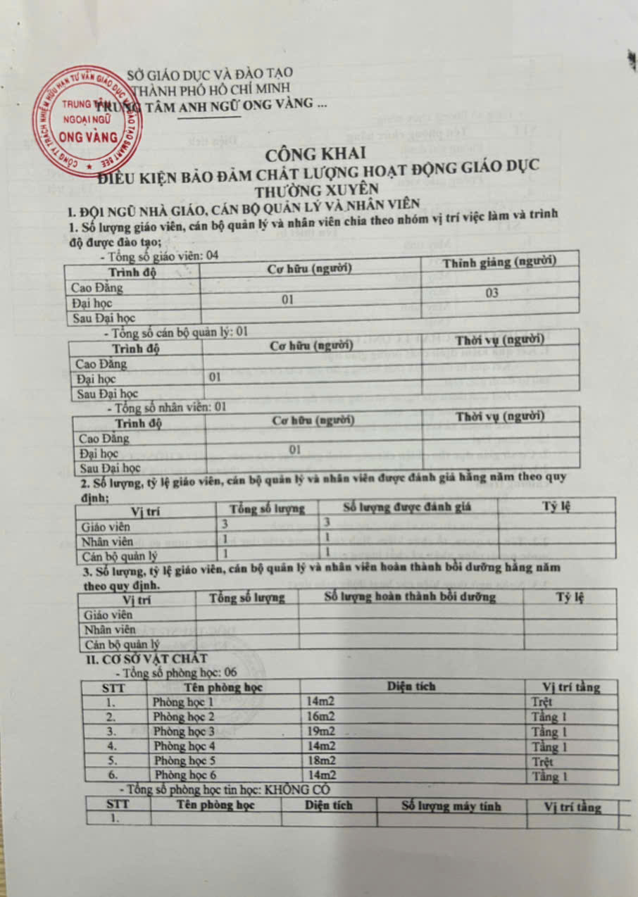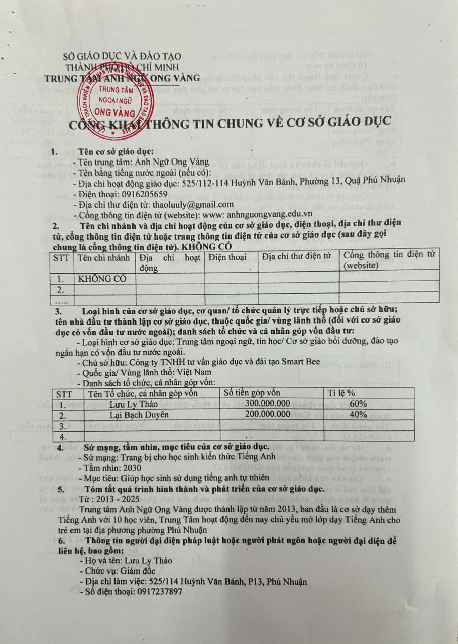 Tất cả các văn bản, giấy tờ pháp lý và tài liệu của Trung Tâm Anh Ngữ Ong Vàng