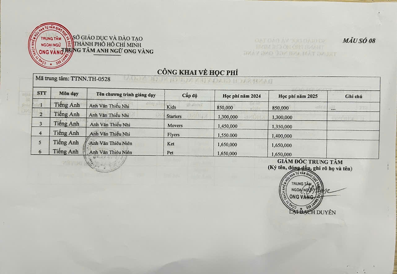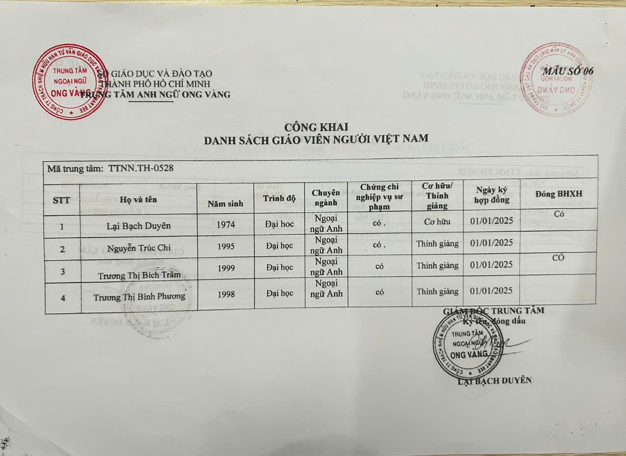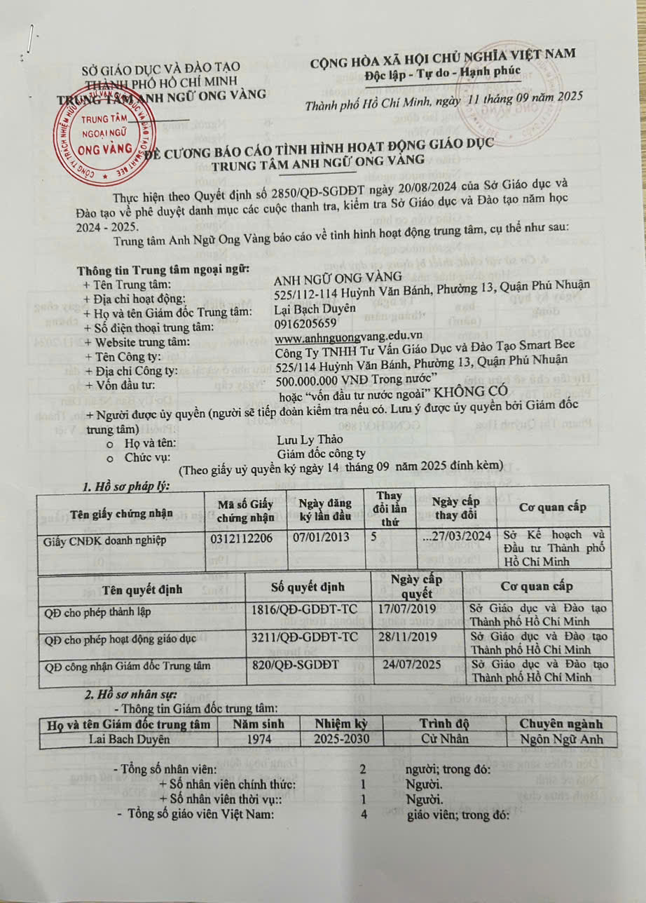 Tất cả các văn bản, giấy tờ pháp lý và tài liệu của Trung Tâm Anh Ngữ Ong Vàng
